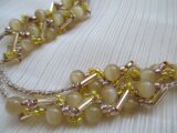 キャッツアイビーズと竹ビーズ、シードビーズをラメ入りのレース糸を使って 華奢な仕上がりの女性らしいデザインです。