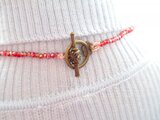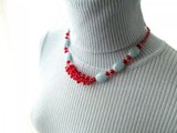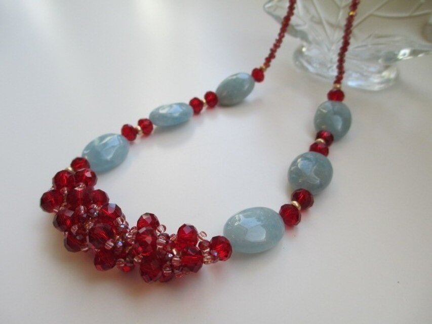 アクアマリンの爽やかなブルーと真紅のビーズを合わせました。
