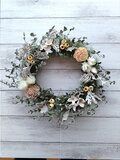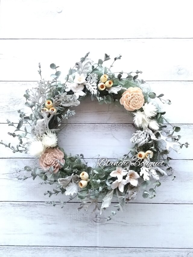 ふんわりとしたデージーとお花が咲いたようなブナの実が愛らしいナチュラルなリースです。