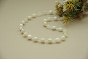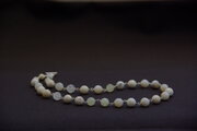美しくカットされたホワイトオパールとサーペンティンを丁寧に眼鏡留めしたネックレスです。ホワイトオパールは半透明や不透明なもの、所どころに模様の入ったものなど、どれも微妙に違っていて見ているだけで楽しい気分になります。フェミニンなお洋服にはもちろん、シンプルな装いにもお使いいただけます。