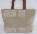 麻糸をメリヤス編みした生地と交互に重ね通し、縫い合わせたバッグです。