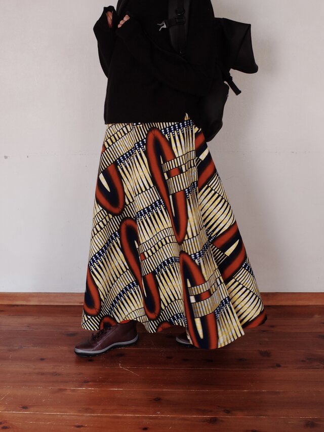 ケニアから仕入れたアフリカンプリント布(キテンゲ布)の半円形の巻きスカートです。仕入れる生地は1枚1枚お店でセレクトしています。布を3m弱使った半円形の巻きスカートは、裾に余裕があり歩きやすくフレアがとても美しいです。分厚めの布を使用していますので、インナーなしで1枚で着られます。寒い時期はタイツやブーツと合わせてもかわいいです。紐通しの裏側に紐を通すホールがあり、しっかりと着用いただけますので、紐がほどけた場合も安心です。