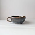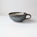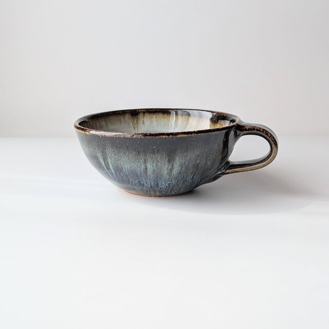 釉薬は、海鼠釉で、深いブルーの中にきれいな釉薬の流れが現れ高級感のある美しいスープカップが出来上がりました。
