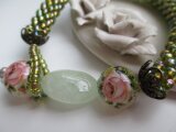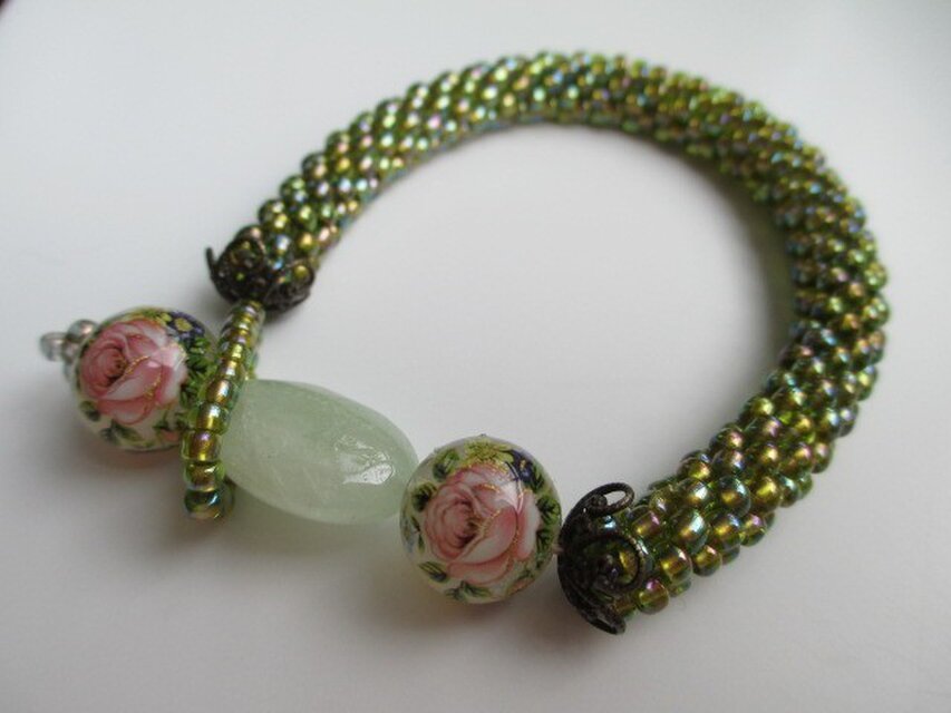 素敵な薔薇の転写ビーズと天然石(エメラルド)とをつなぎ合わせました。