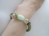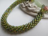 深く味わい深いグリーンのビーズでクロッシェ部分を編み、