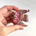 ブラウンを基調にピンク、茜色、うすいピンク色3色と少しグリーンを入れて製作しました。