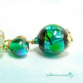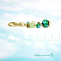 優しいグリーンの天然石カルセドニー、艶やかなオーロラ加工が施されたエメラルドカラーのチェコビーズ、そしてゴールドのラインが入ったビーズたちが、上品な華やかさをプラス。