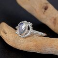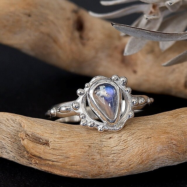 ブルーの輝きが浮かぶレインボームーンストーンを、輪に粒飾りを付けたアシンメトリーなデザインリングに仕上げました。
