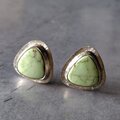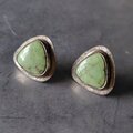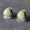 淡い黄味がかったグリーンがやさしい印象のターコイズを飾り枠を施しシルバーピアスに仕立てました。