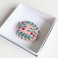 サーモンピンクの地に黒い花の刺繍、ありそうでなかったこの色のとりあわせ、すてきなブローチでした。