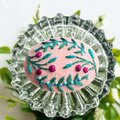 桃色のリネン地に小さな草花を丁寧に刺繍しました。