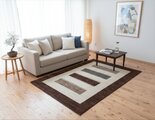 ベージュが基調とし、中はダークブラウン、グレー、ブラウンの太いラインが入っております。フレーム(額物)はダークブラウンでデザインを引き締めております。