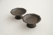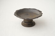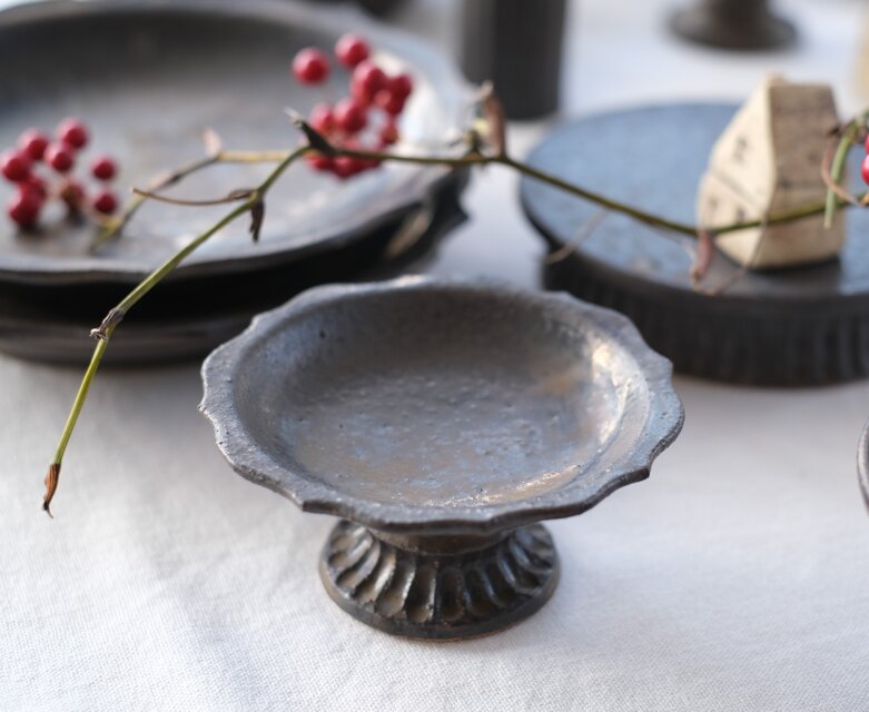 黒釉高台付輪花皿です。