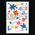 白地に描かれた青と黄色の星とラインが、アートに生命を吹き込みます。シンプルながらも力強い表現が特徴。
