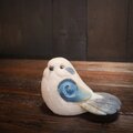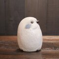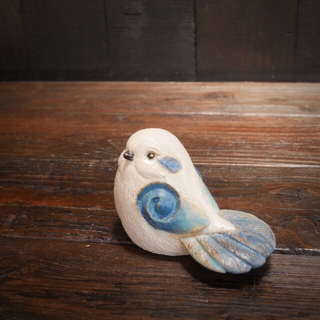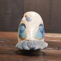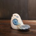 色土で羽の色を塗り分け素焼き後、ゴムのりでマスキングをしたり外したりしながら釉薬を吹き分け本焼成します。瞳に焼き付ける金彩で個性と表情が息づきます。