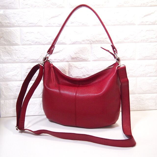 ★ハンドメイド★日本製★牛革★2WAYショルダーバッグ(ロングハンドル・肩掛け)★アk色★コロンとしたスタイル★超軽量★