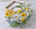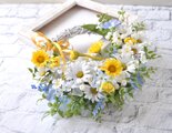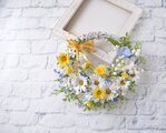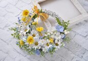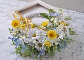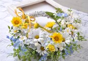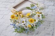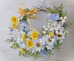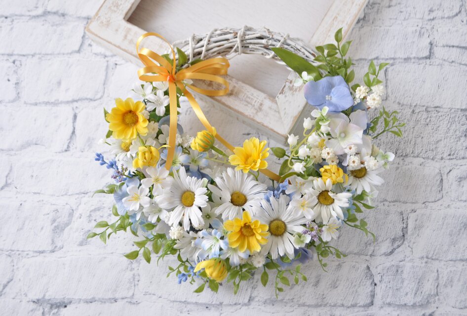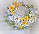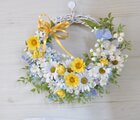 リース素材:アーティフィシャルフラワ-(造花):マーガレット・マム・あじさい・カスミソウ・パステルフラワー・ベロニカ・グリーン、など。その他:リボン飾り(黄・細サテンリボン・取り外しできます)。