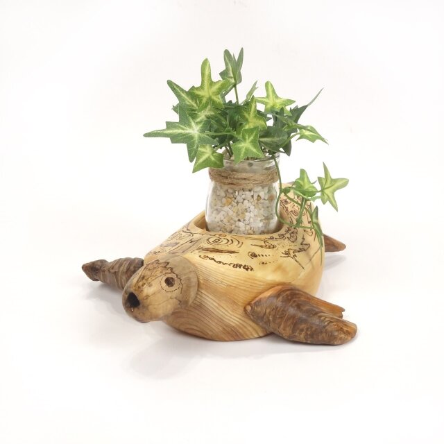 流木でウミガメを形作った、小さな鉢などを置けるグリーンスタンドです。