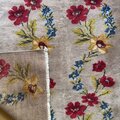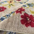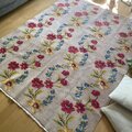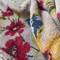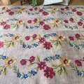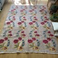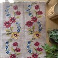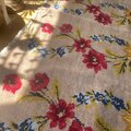 長い月日を経て、時間が作り上げた味わい深い一枚。赤、黄色、青の流れるような大きなお花のレアなデザイン。