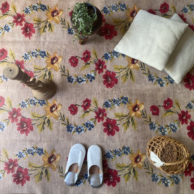 お花がお部屋に華やかさを、ヴィンテージラグならではの落ち着きをプラスしてくれます。