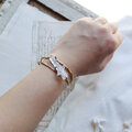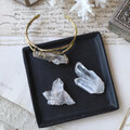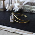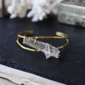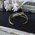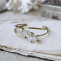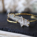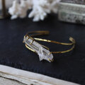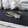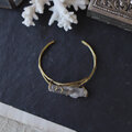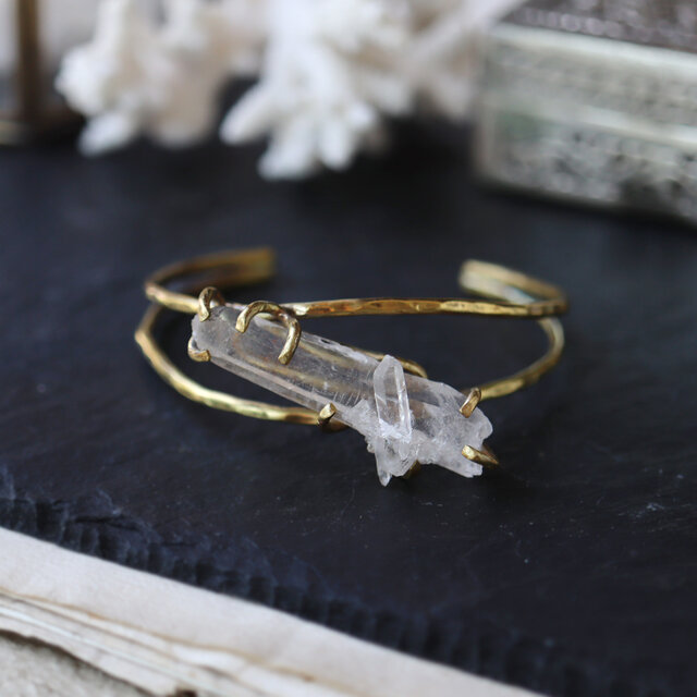鉛筆型に育つ結晶がいくつか合体した美しい形、石内部のクラック(天然の傷)に光が反射し、虹色の光が見えるヒマラヤクォーツ。大振りで個性的な原石を、真鍮の爪で有機的に留めたバングルです。あたたかいゴールド色の真鍮は、使い込む程にアンティークな質感へと変化していきます。
