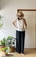 ウエスト部分は後ろのみゴムを使用し、前は紐にて調節できるようになっているので、ストレスフリーで履いていただけます。さらに股上を長めにとり、ヒップ周りもゆったりと楽にに履いていただけるシンプルなデザインのロングパンツです。生地は薄いので夏は涼しく、冬でも中にレギンスやタイツなどを中に一枚履いていただければ一年を通して楽しんでいただける万能パンツです。