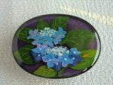 「ガクアジサイ」の帯留めは紫色の地色に白と淡い水色の花、そして青い装飾花を描いたものです。
