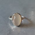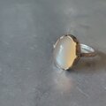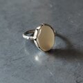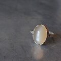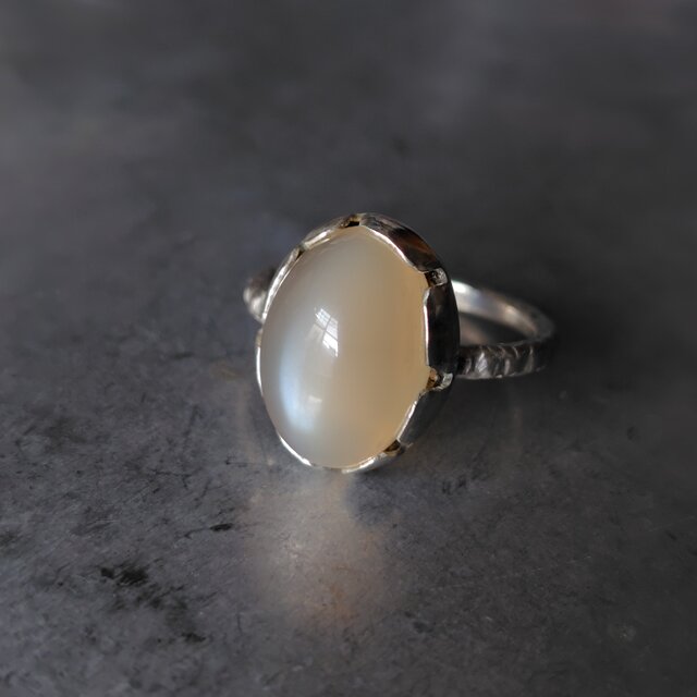肌馴染みの良いオレンジベージュにシルバーホワイトのシーンとキャッツアイが美しいオレンジキャッツアイムーンストーンを咲きはじめる花シルバーリングに仕立てました。