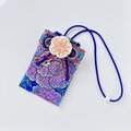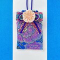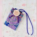 光沢のあるブルーに大柄のピンクの花柄が映えるオリエンタルな世界観のシノワズリなお守り袋です