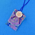 お守り袋には、絹、木綿、麻、羊毛、ビーズなどで作られた「ブレード」と呼ばれる紐やインドの刺繍リボンを組み合わせました