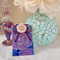 お守り袋には輸入もののリボンやブレードをあわせ、お守り袋用の紫紐で「叶結び」にしています