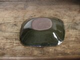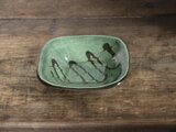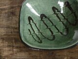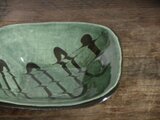 素地にクリーム状の化粧泥で模様を描いてから織部釉を掛けて焼成しています。