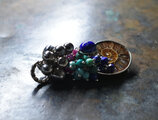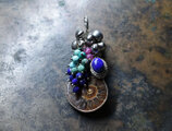 アンモナイトと繊細シルバー装飾ラピス、とたわわな鈴とターコイズ&ラピス&ルビーを繋いだペンダントトップです。
