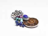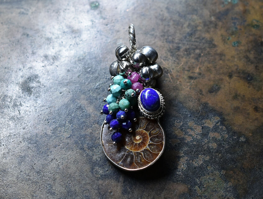 アンモナイトと繊細シルバー装飾ラピス、とたわわな鈴とターコイズ&ラピス&ルビーのペンダントトップ