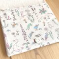 動物や植物たちが布の上を縦横無尽に走り回っている様子を手書きしたような
