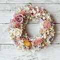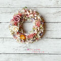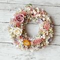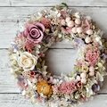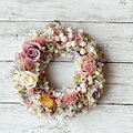 優しいピンクのバラが素敵なややグレイッシュカラーの豪華なリースです。