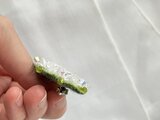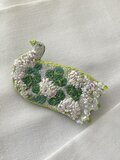 体全体の縁取りには、春の色味明るいきれいな黄緑色を使いました。尻尾には透明感、光を通すときらきら輝くビーズと、黄緑のきれいな丸みのあるビーズを3つアクセントにつけました。
