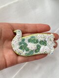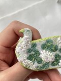 今までのkanac.embroideryでつくる鳥さんブローチとは異なり、水鳥さんのように水面に浮かぶような姿の横に長い鳥刺繍ブローチです。