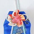 お守り袋にあわせた花は「つまみ細工」という日本の伝統工芸の技法を使い、花びら1枚1枚作っています