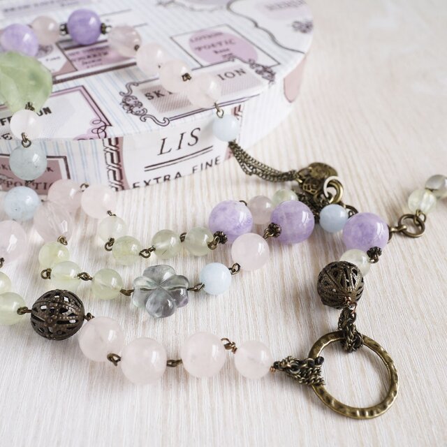 【素材】プレナイト、ライトアメジスト、ローズクォーツ、アクアマリン、フローライト、真鍮メッキ