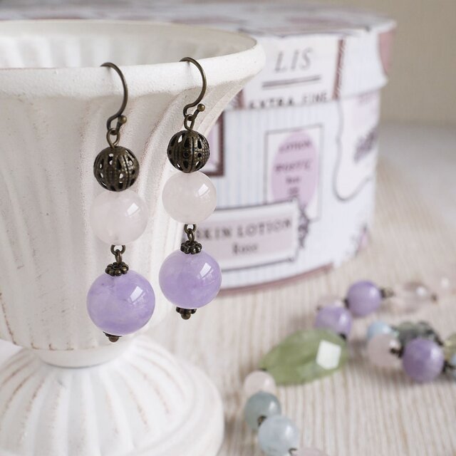 【素材】 ライトアメジスト12mm、ローズクォーツ10mm、真鍮メッキ
