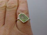 接着剤に頼らずカッチリとセットしたペリドットのシンプルなシルバーリング*ポイント状のペリドット原石、実際の色は写真よりフレッシュなグリーンです*ひとつとして同じ物が無い結晶による1点モノをお楽しみ下さい。。。現在は半艶マットシルバーですがご希望により少し燻してアンティーク調の仕上げも可能です*サイズは8号~15号で調整出来ます。(サイズ調整後の石留めですので現在は縁が立っています)