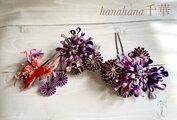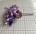つまみ細工の代表、半薬玉は紫とゴールドでクールさを演出します。(写真はシルバーに見えますがゴールドです。)