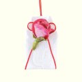 白い生地に赤いバラを合わせることで、乙女心をくすぐるバラのお守り袋に仕上げました