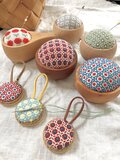 木工房で作っていただいたウッドボウルを使用したピンクッションです。
