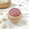 木工房で作っていただいたウッドボウルを使用したピンクッションです。