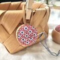 クッション部分は、オフホワイトの刺繍布に少し深めの赤とくすんだ青の刺繍糸で刺繍を施しています。
