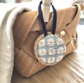 クッション部分は、フローズンブルーの刺繍布にきなりとピンクの刺繍糸で刺繍を施しています。