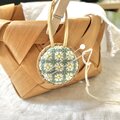 クッション部分は、ソフトグリーンの刺繍布にきなりとイエローの刺繍糸で刺繍を施しています。