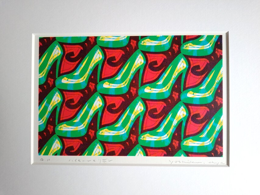 境界線によって出来る模様を模索しています。ハイヒールとリボンの2つのパターンで画面を構成しています。